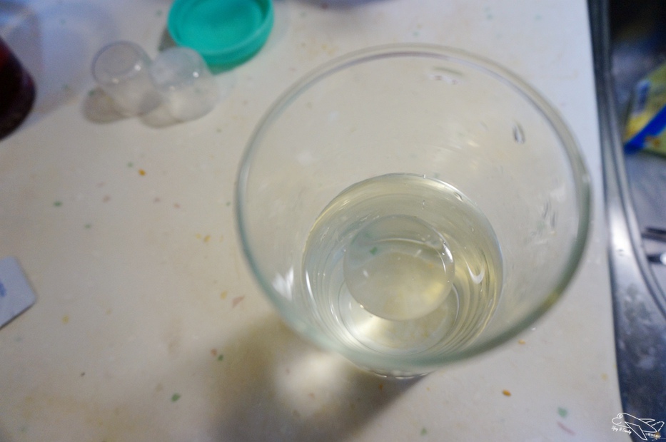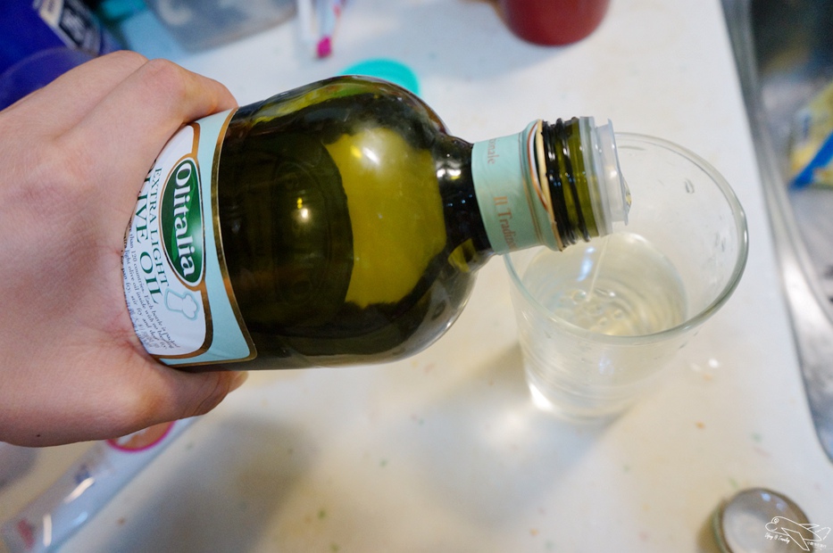 我在杯中放入開水再倒入橄欖油~帶著半信半疑的感覺來試試看是不是真的有包覆油脂的效果~